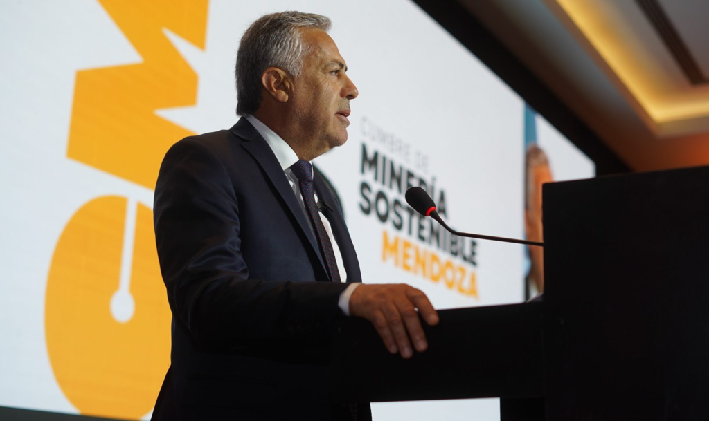 Gobernador Alfredo Cornejo inaugurando la jornada bursátil de la Bolsa de Valores de Toronto desde Mendoza.