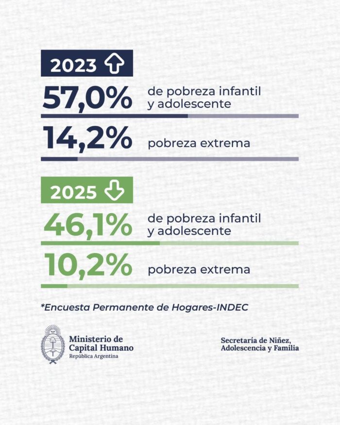 El Ministerio de Capital Humano explicó que la baja responde al fortalecimiento de las políticas sociales (AUH y Prestación Alimentar) y a la estabilidad inflacionaria. A continuación, las placas oficiales difundidas tras conocerse el informe de UNICEF.